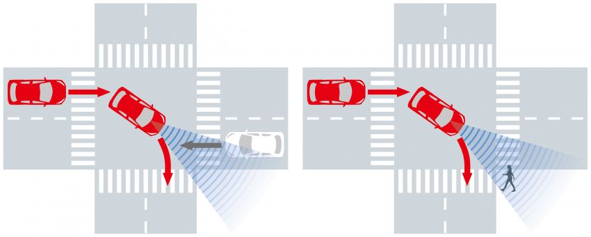 Sistem terbaru dapat mencegah kecelakaan saat berbelok di persimpangan dengan mendeteksi kendaraan yang melaju serta pejalan kaki yang menyeberang jalan.