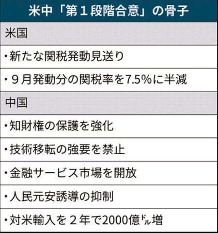 両政府は今後、合意文書の詳細を詰めて20年1月の第1週に閣僚級がワシントンで署名する予定だ。米政権は9月に1200億ドル分に発動した15%の制裁関税を7.5%に引き下げる方針で、文書の署名後30日後に実施する。