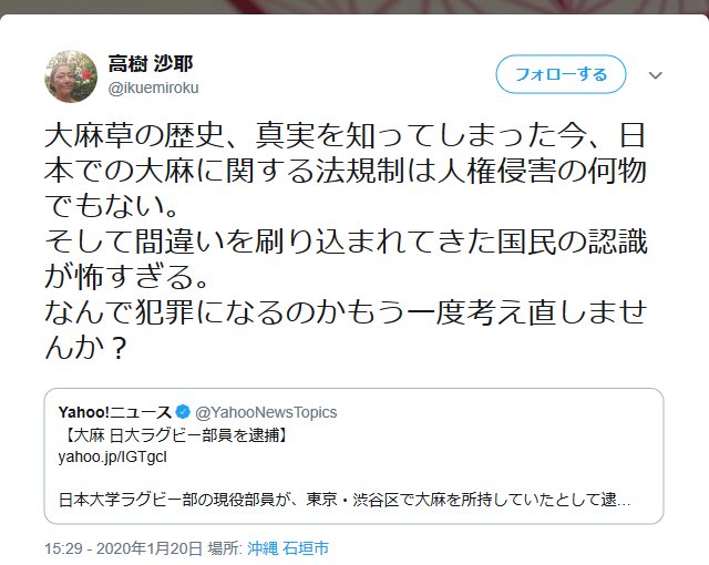 0 Response to "高樹沙耶さん「日本での大麻に関する法規制は人権侵害の何物でもない」 日大ラグビー部員の大麻所持逮捕でツイート - ニコニコニュース"