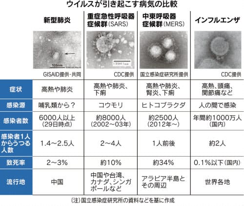 感染症のリスクを比較する上で致死率も大きな要素となる。SARSは約10%、MERSは約34%だった。今のところ新型肺炎は2~3%程度と低い。