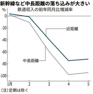 鉄道事業への打撃は大きい。5月の鉄道収入(定期除く)は前年同月比83%減った。一般的に採算がよい新幹線など中長距離の収入は95%減と、近距離(72%減)より落ち込みが激しい。新型コロナの影響は970億円の減収要因になり、4月と合わせると2000億円弱にのぼる。
