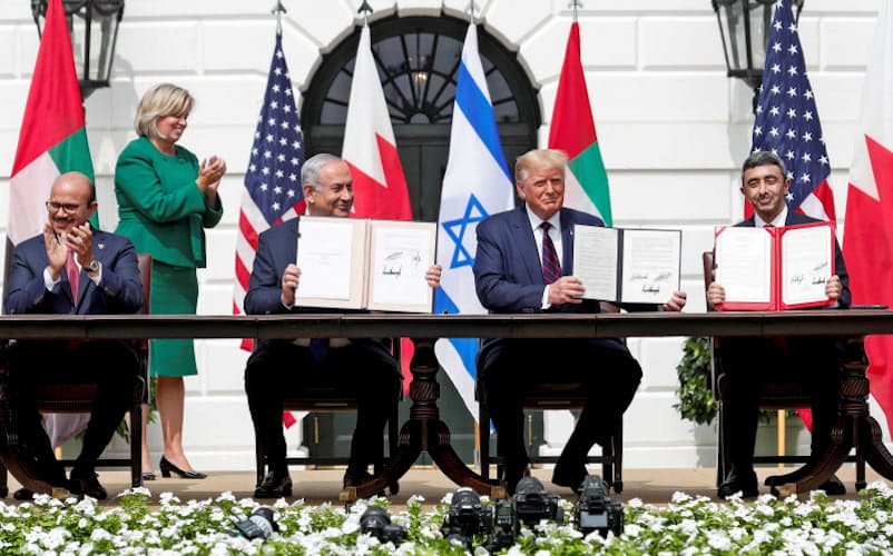 【ワシントン=中村亮、カイロ=久門武史】イスラエルは15日、米ホワイトハウスでアラブ首長国連邦(UAE)やバーレーンと国交正常化の合意文書に署名した。共通の脅威とみなすイランに対する結束を強める狙いがあり、他のアラブ諸国も追随する可能性がある。トランプ米大統領は和平を仲介し、11月の大統領選に向けた成果を有権者にアピールした。